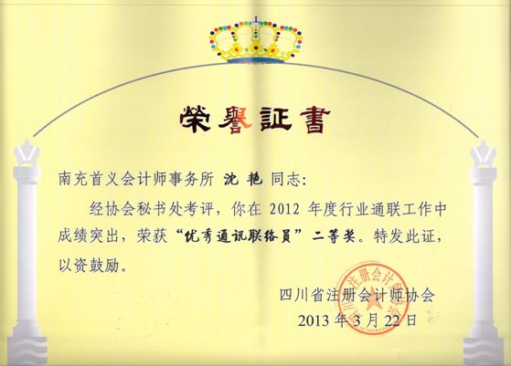 2013年4月9日下午,四川省注册会计师协会召开了2012年度优秀通讯联络员表彰暨培训会。会上,协会对评选出的33名优秀通讯联络员给予了表彰,其中一等奖6名,二等奖10名,三等奖17名。我所办公室主任沈艳荣获“优秀通讯联络员”二等奖。