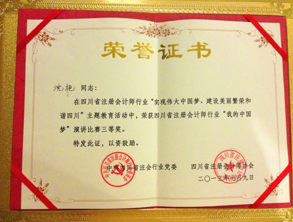 热烈祝贺我所办公室主任沈艳荣获四川省注册会计师行业“我的中国梦”主题演讲比赛三等奖。