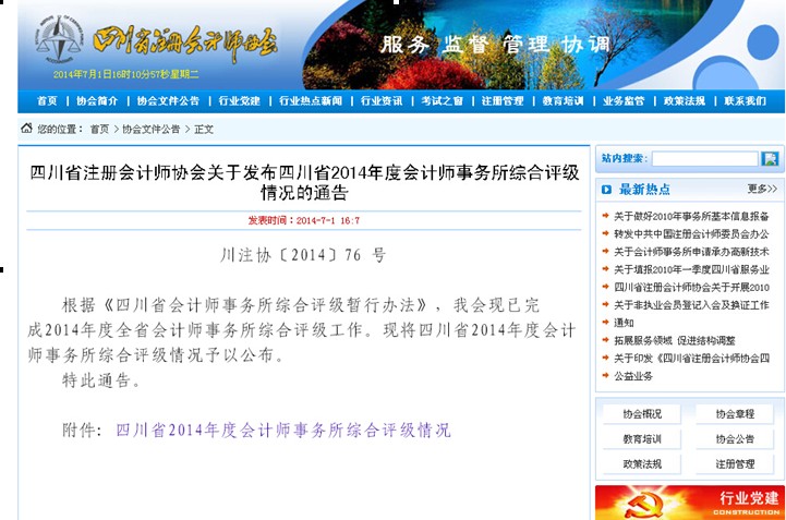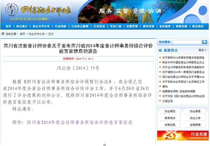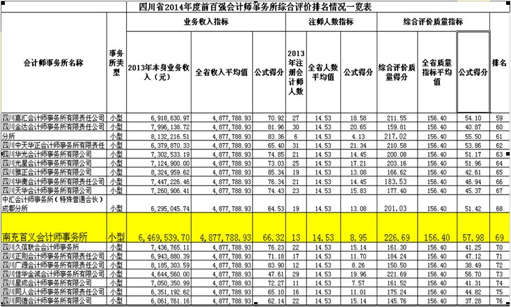 热烈祝贺我所2014年再次跻身四川省会计师事务所综合评价前百强,排名第69位。至此,我所已连续四年跻身四川省会计师事务所综合评价前百强会计师事务所。