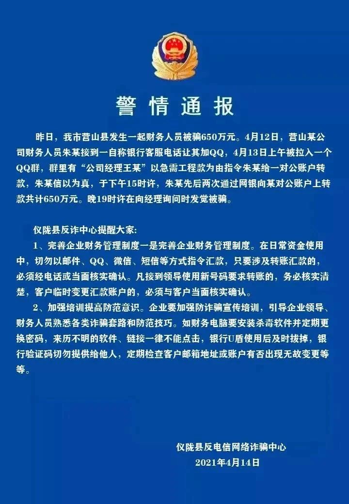 紧急提示 警情通报:南充一公司财务人员昨日被骗了650万元!!!